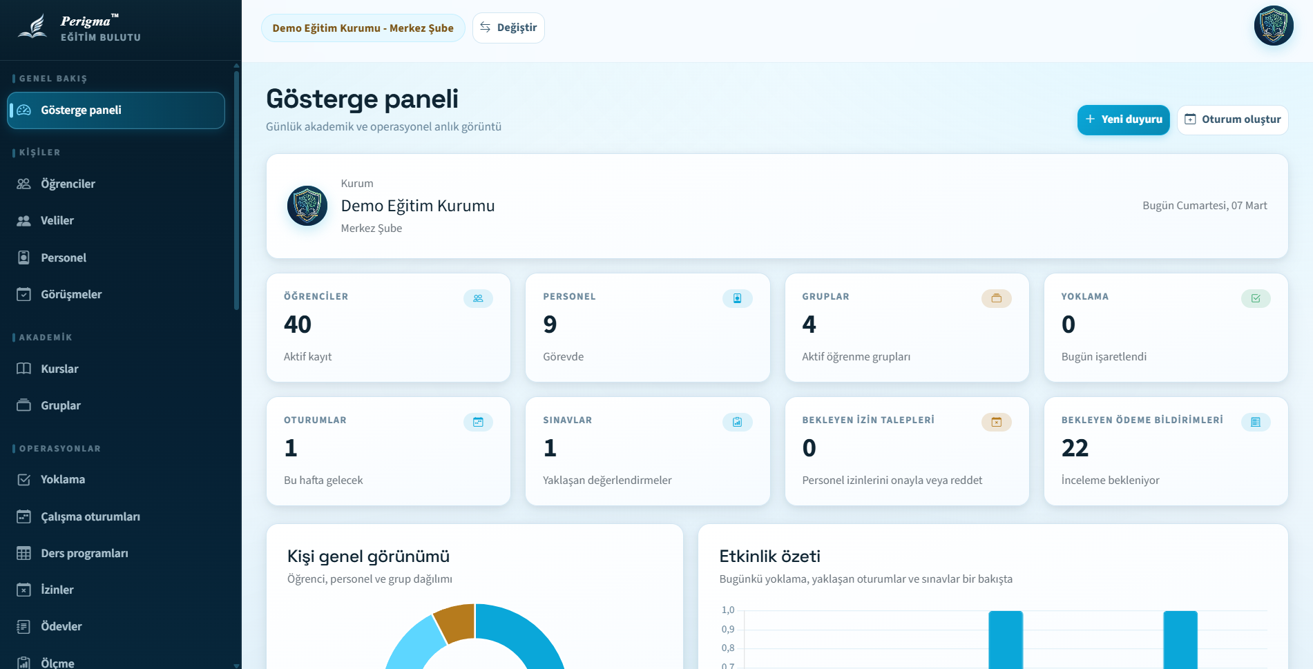 Perigma, dershane, özel okul, etüt merkezi ve kurs gibi eğitim kurumlarının günlük operasyonlarını dijitalleştirerek zamandan tasarruf sağlar ve karar alma süreçlerini veriye dayalı hale getirir.
