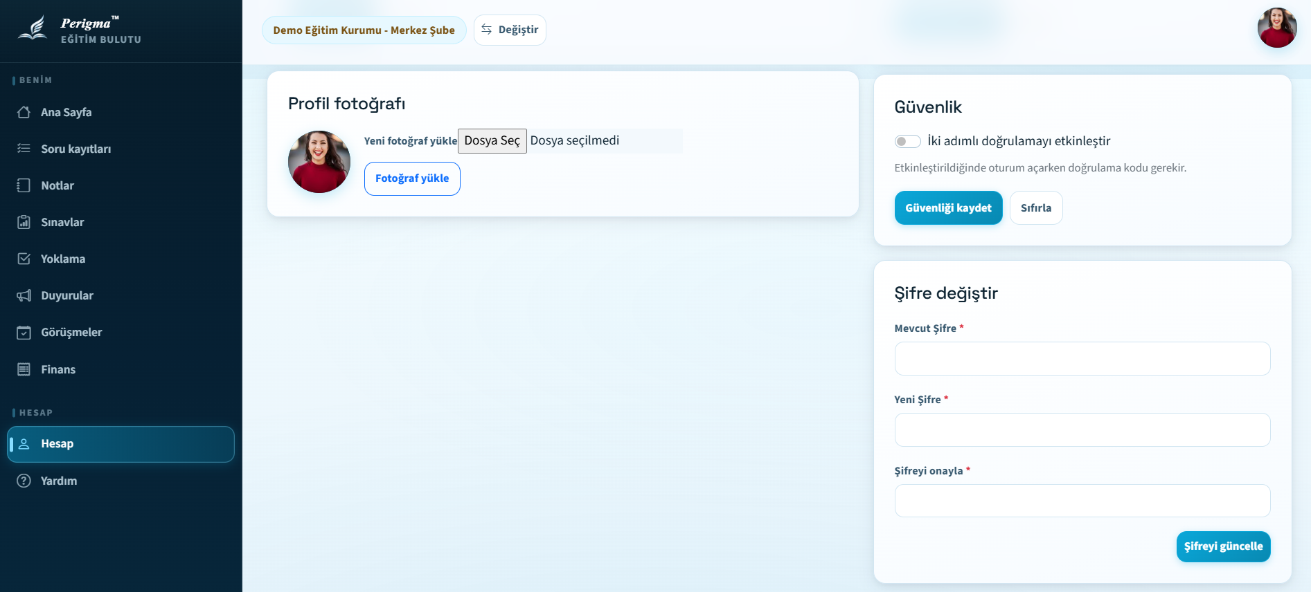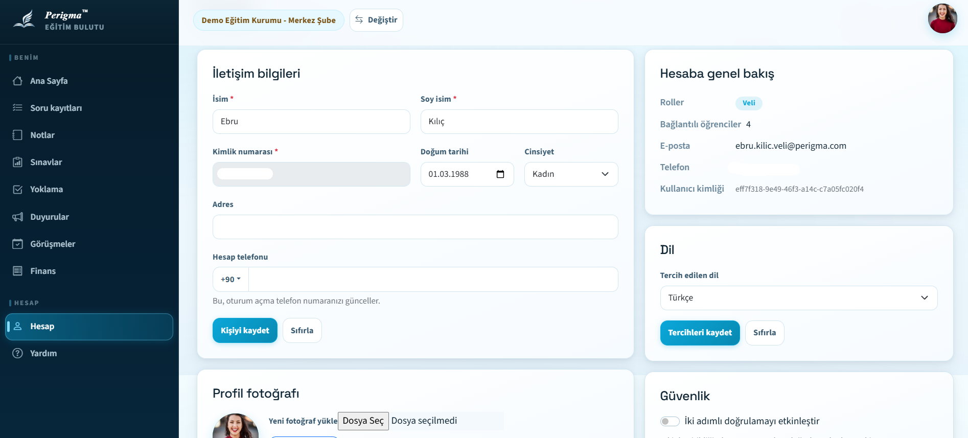 Perigma'da profil sayfanız üzerinden kişisel bilgilerinizi güncelleyebilir, profil fotoğrafınızı yükleyebilir, dil tercihinizi değiştirebilir ve şifrenizi yenileyebilirsiniz.