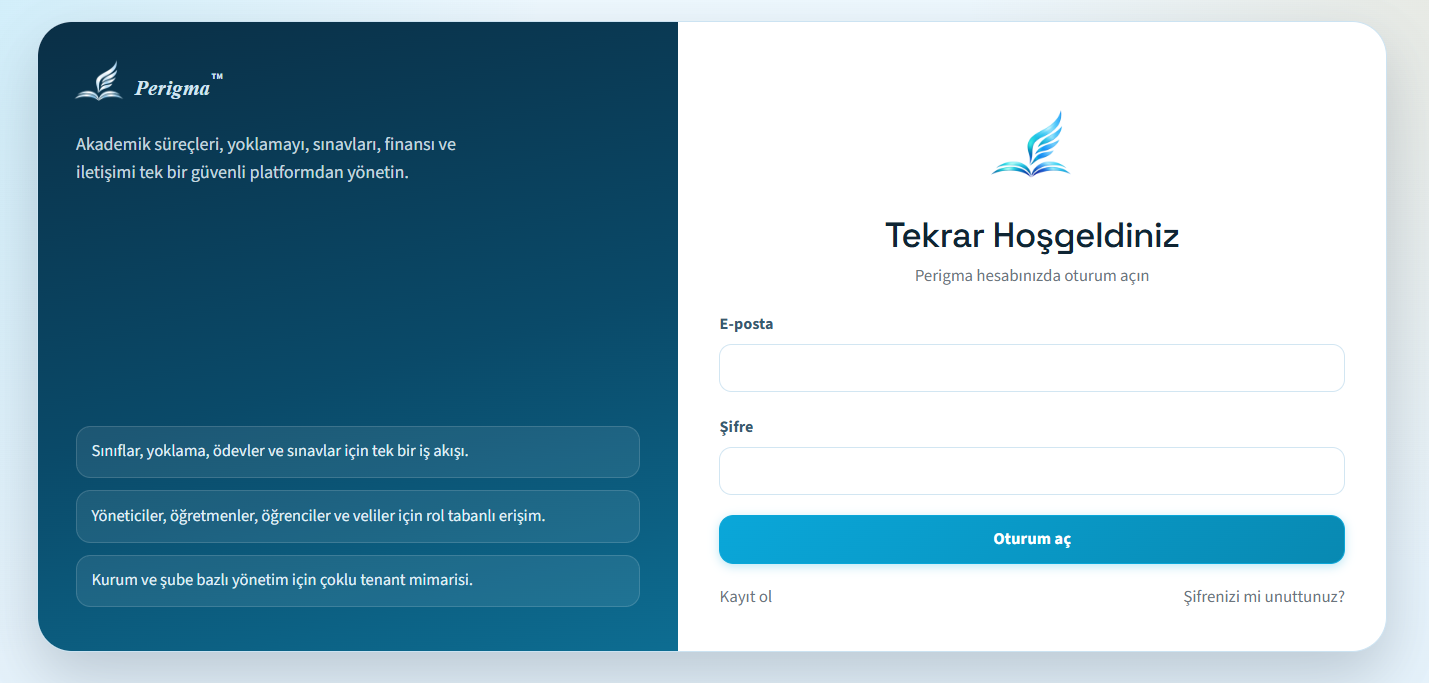 - Perigma'yı açın (uygulama veya app.perigma.com); giriş ekranı karşınıza gelir