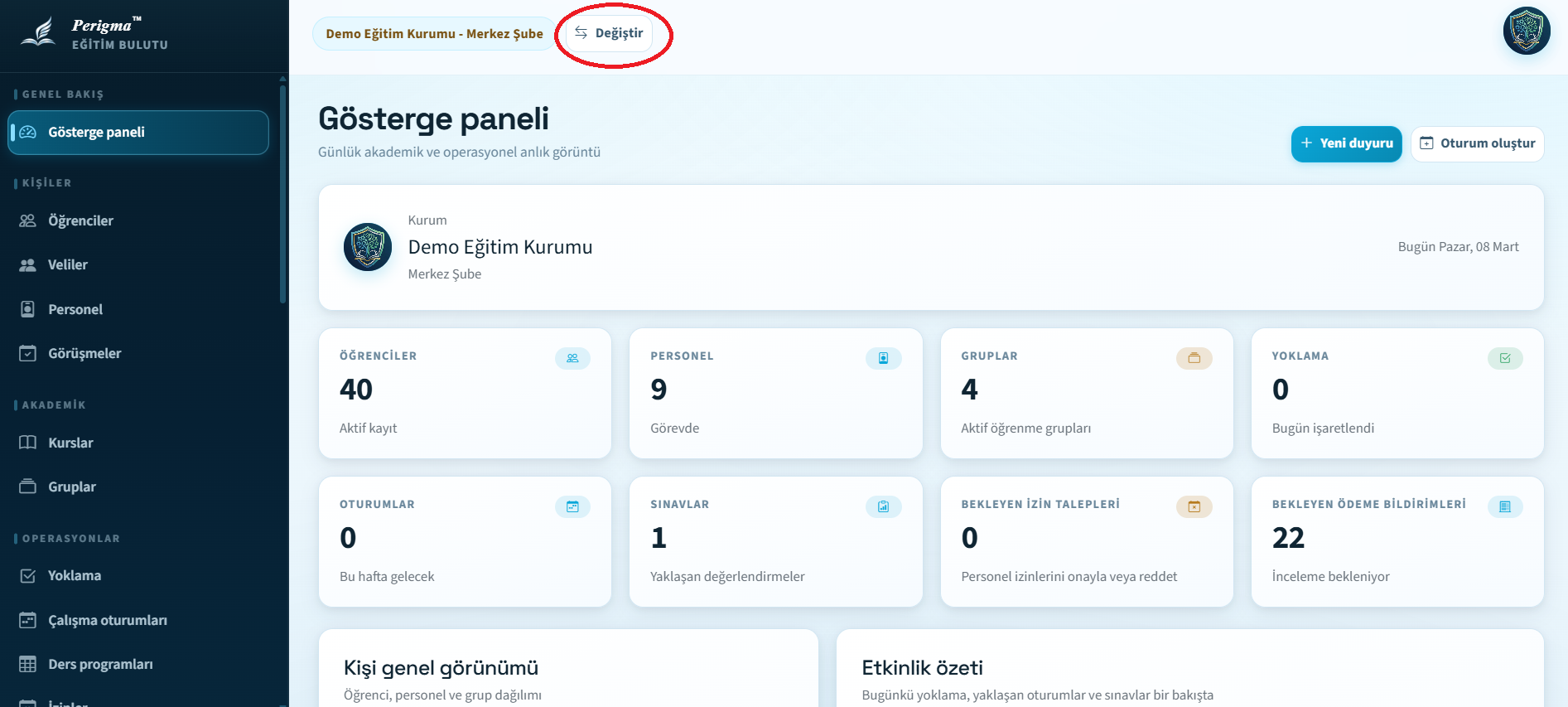 - Üst çubukta (veya daha menüsünde) mevcut kurum adınıza tıklayın
