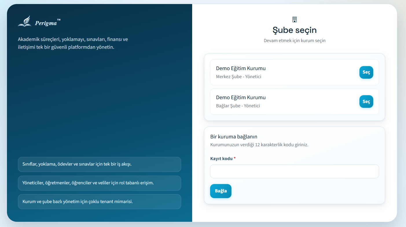 Birden fazla kurum/şubeye bağlıysanız giriş sonrası kurum seçimi ekranı açılır. Çalışmak istediğiniz kurumu seçerek devam edebilirsiniz. Aynı ekranda bulunan kuruma bağlanma alanından katılım kodu girerek yeni kurum/şube bağlantısı da ekleyebilirsiniz.